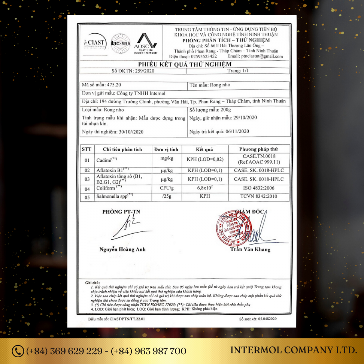 Tự hào là một trong những thương hiệu cao cấp tại Việt Nam, tất cả các sản phẩm của Công ty THHH INTERMOL được nuôi trồng trong môi trường thiên nhiên, quy trình chế biến và sản xuất khép kín. Chất lượng được đảm bảo theo tiêu chuẩn của Bộ Khoa học & Công nghệ Việt Nam.